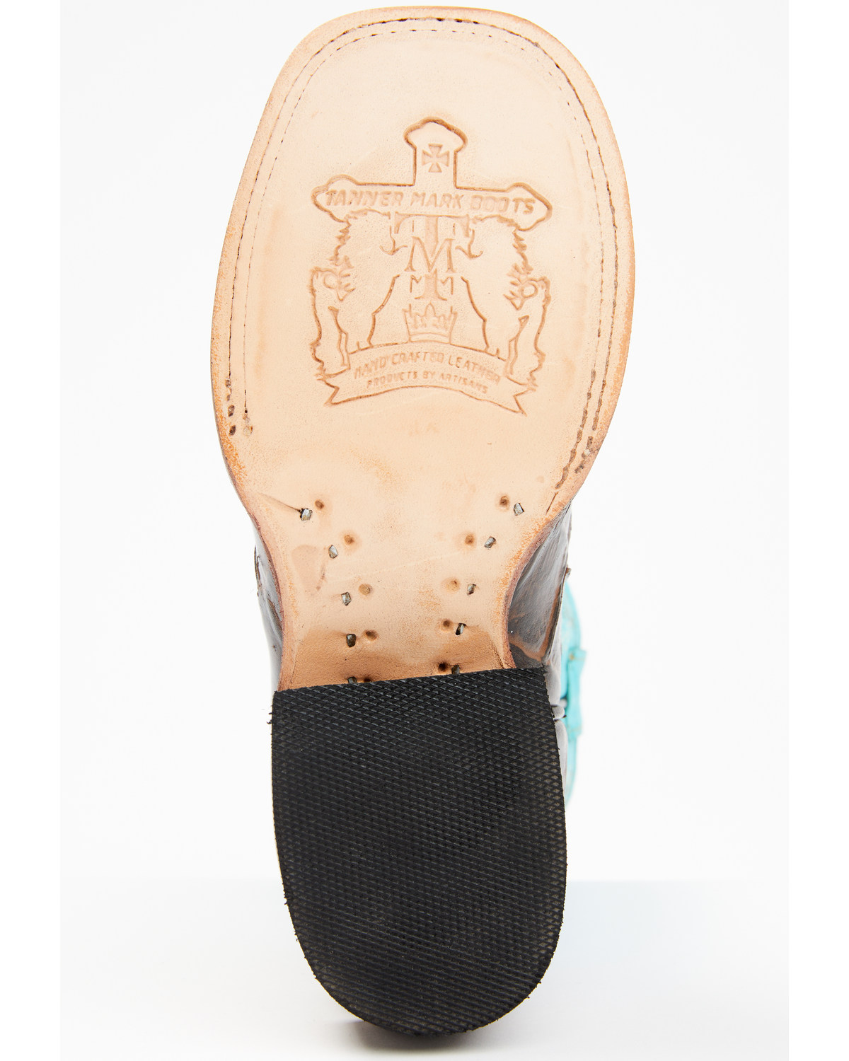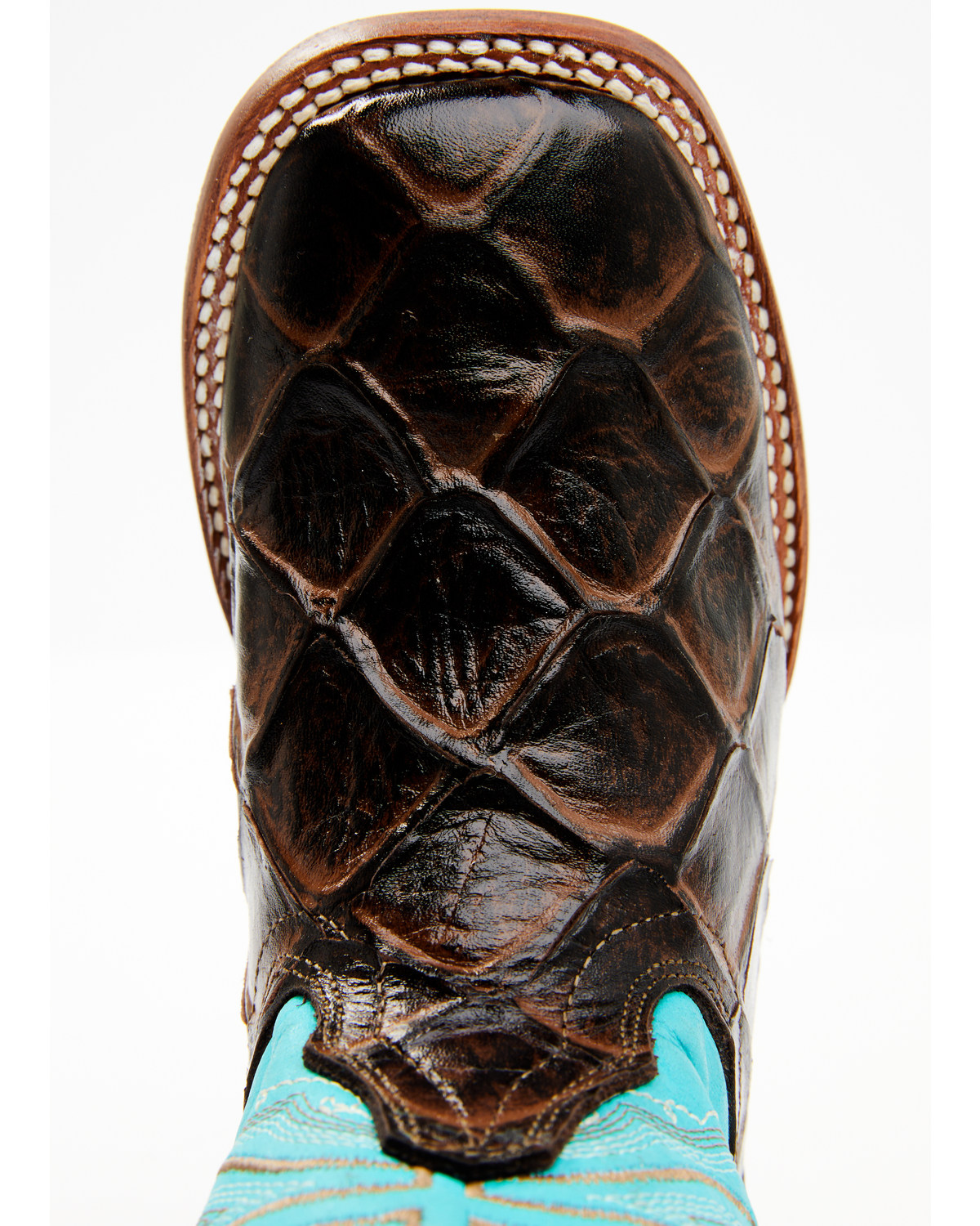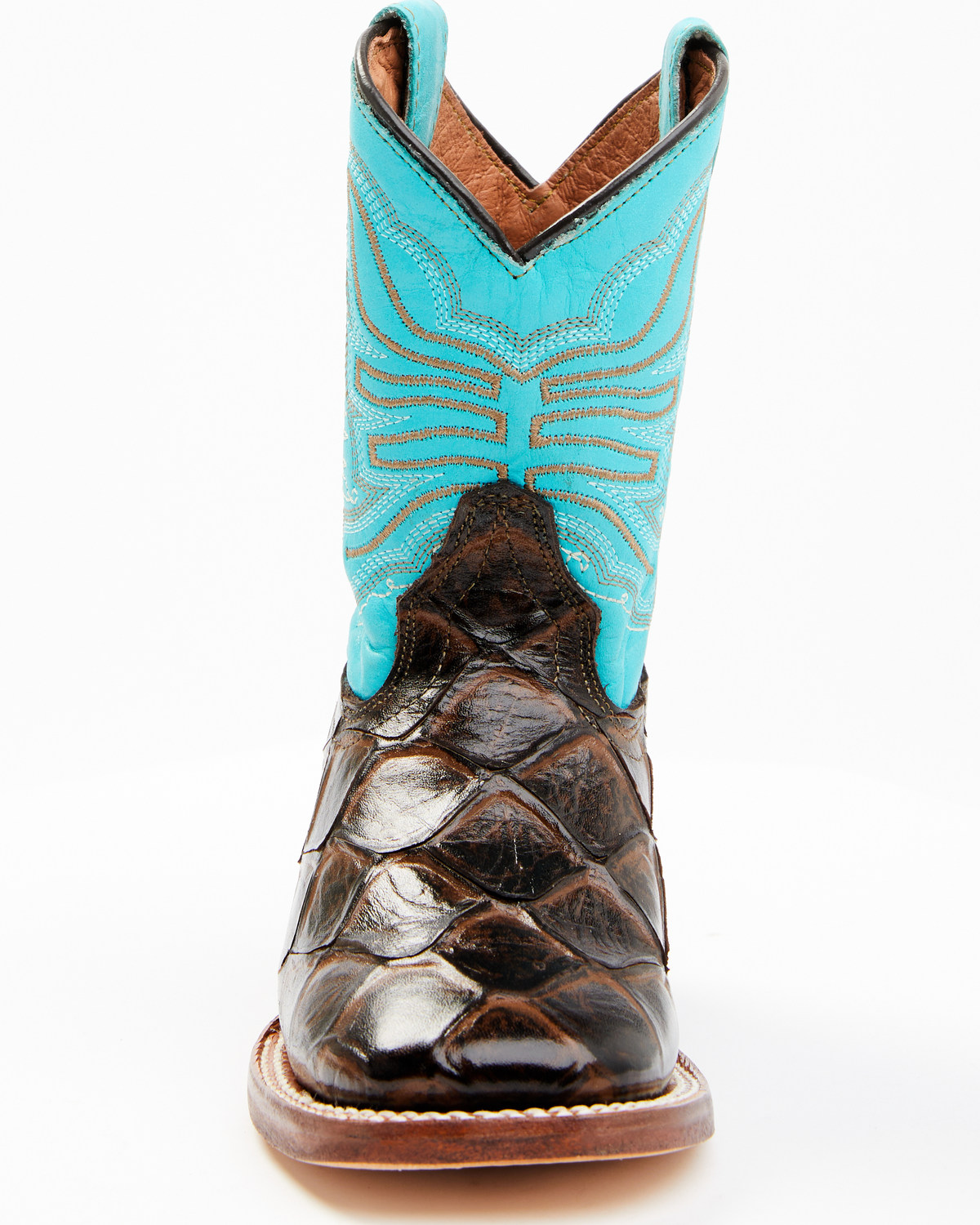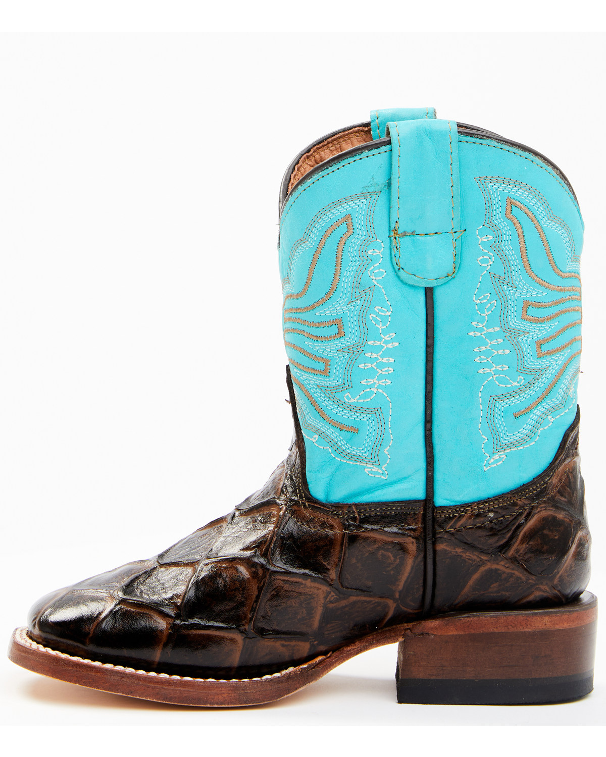 - Brown fish print embossed vamp with turquoise shaft